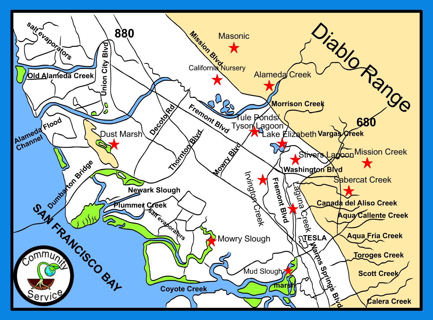 Go over the rest of the Watersheds powerpoint. (Slides 2-8). These slides define watersheds and end up back with the tri-city map. Have students outline the Mowry Slough Watershed, Laguna Creek Watershed, and Alameda Creek watersheds on the map.