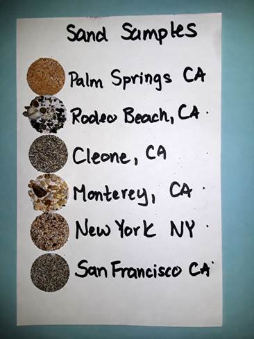 Prepare sand cards. Tell students they will get to look at 6 sands and try to figure out the parent rock for each and the life history for each. Each students will prepare a Sand Card with examples of sand from 6 different beaches (5 from California,1 from New York) that have variable parent rocks and erosion histories.