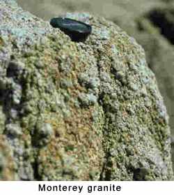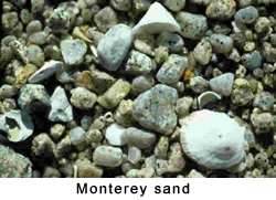 MONTEREY, California - 025 -7mm; very poorly sorted; subangular. Contains quartz, feldspar and pieces of granitic rock. The Mother rock is a granite, but unlike Montara Beach sand, Monterey has not been chemically weathered. Abrasion of large boulders of granite along the coast have mechanically broken this sand.