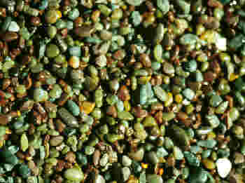 RODEO BEACH, Marin County, California -0.1 -7mm; poorly sorted; angular - rounded. Contains chert, serpentinite, quartz, basalt, magnetite. This beach is in a cove behind the Golden Gate Bridge, where very high energy waves erode the rocks exposed along this coast. The source rocks include chert, serpentinite, and basalt.