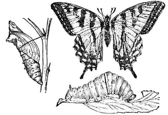Caterpillar (Larva): The newborn caterpillar constantly feeds, eating several leaves daily. As it grows the caterpillar will molt, crawling out of its old skin having formed a fresh, new skin underneath. It will grow to its full size of about 2 inches (5 cm) long.
