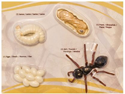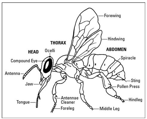 Go over the life cycle of bees. Use the model to point out the long antennae, 2 pairs of wings, and smaller compound eye. Egg: The Queen bee lays between 1500 and 2000 pinhead-sized eggs each in its own cell. The queen is able to lay both fertilized eggs that produce both fertilized eggs that produce queens, sterile female workers and unfertilized eggs that produce male drones. Larva: After 3 to days the eggs hatch into larvae which are fed by worker bees. A future Queen is fed “royal jelly” a substace secreted from glands in the heads of worker bees. A future worker is feed “bee bread” which is a mixture of pollen and nectar. Pupa: At this stage the pupa does not eat, gegins losing its worm shape and starts to develop the eyes, wings, and legs of a n adult bee. This stage takes 6 days for a future queen and 11 days for a worker. Adult: The adult bees have different jobs and life spans. Sterile femaile workers liver 20 to 40 days, tend to young bees and guard the hive entrance or are field workers that collect pollen, nectar and water. Drones live 30 to 90 days and their only role is to mate with the Queen.