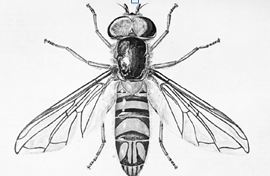 Hover Flies (left) may sometimes confused with stinging bees or wasps because of their mimic color. Their bodies are medium to slender. On their abdomen there are the yellow-black wasps pattern and the narrow waist mimic pattern. Hover Flies visit flowers as bees and wasps. They are major pollinators of some flower plants. They are usually seen hovering or resting on flowers. How can you identify. On the figure to the right notice that the antennae are small, there is only pair of wings, and eyes are larger.